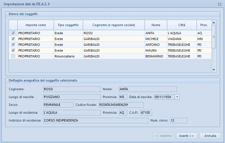 Dalla prima schermata del wizard sarà necessario selezionare i soggetti (eredi o rinunciatari) da importare all'interno della nuova pratica.