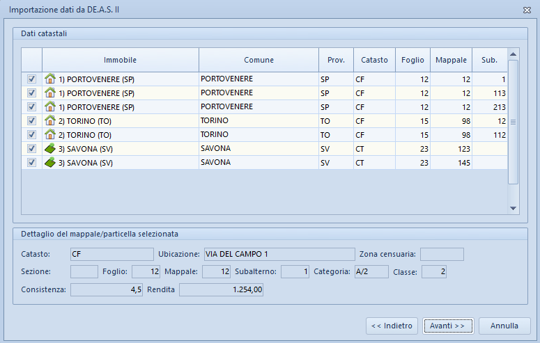 In seguito, dalla seconda schermata del wizard, si dovranno selezionare gli immobili da importare all'interno della nuova pratica.