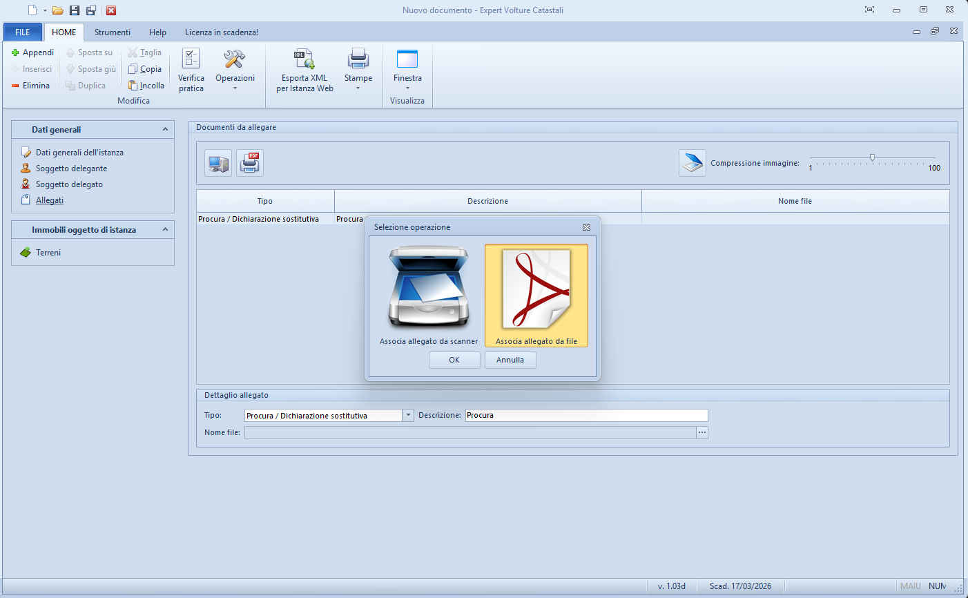 - Associa allegato da scanner: sostituisce il file associato all'allegato selezionato con un'immagine acquisita direttamente dallo scanner