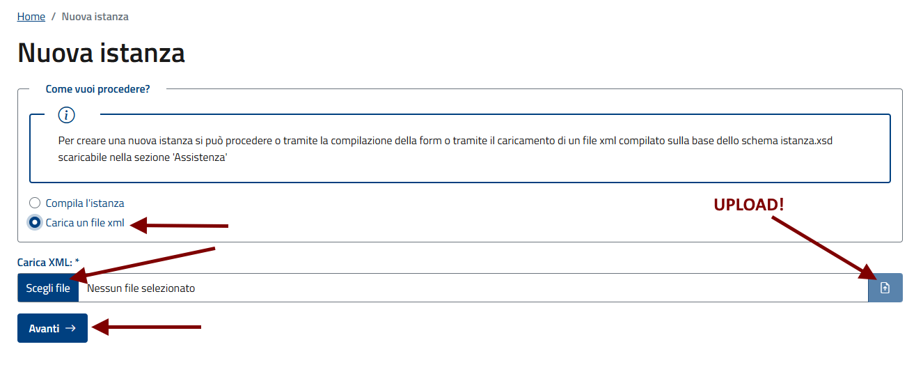 Per importare l'xml è necessario che il richiedente o il delegato - che risulta dall'xml - coincida con l'utente che si è autenticato nell'area riservata (con SPID, CIE, CNS ecc.).